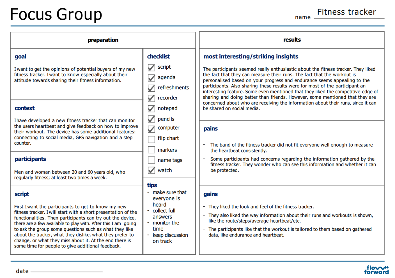 Use the Focus Group template to prepare for the Focus Group meeting. The template can also be used to capture the results. Have a look at the example of FitnessTracker to see how they have