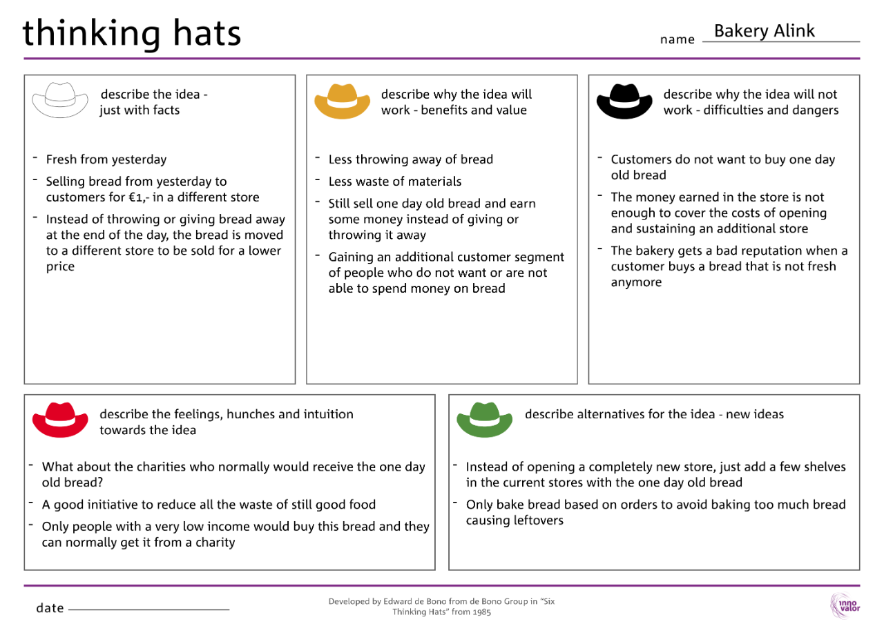 Use the Thinking Hats template to make a large printout. Use this printout to do an analysis on your idea or brainstorm with others. Have a look at the example of the innovative Bakery Alink to see how they have used the Thinking Hats.